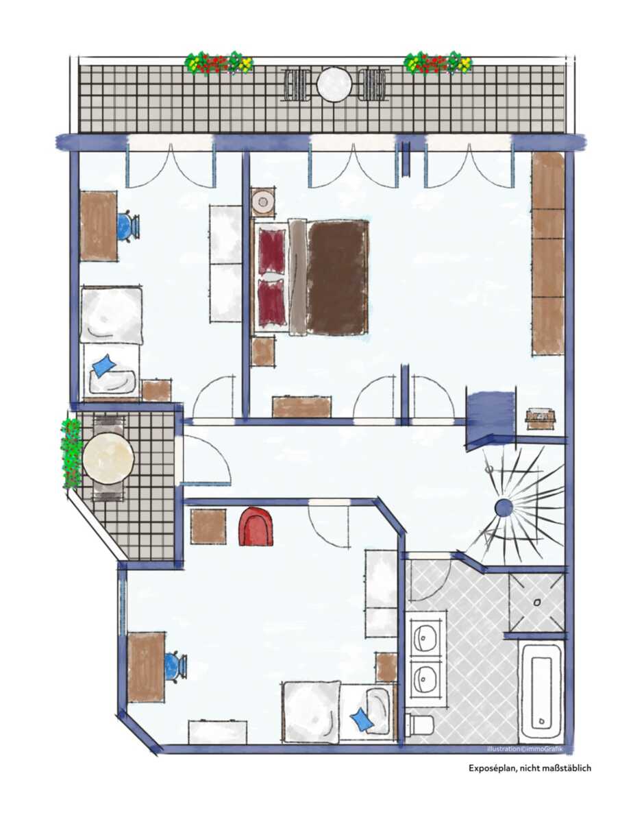 Dusche, Doppellavabo und WC. Das Dachgeschoss bietet zusätzliche Flexibilität: Ob als weiteres Schlafzimmer, gemütliche